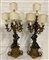 Coppia di candelabri a sei fiamme in bronzo parzialmente dorato, fusti con amorini bruniti e decori a motivi naturalistici (h cm 65), montati a luce elettrica (h con paralumi cm 86) (difetti e mancanze)