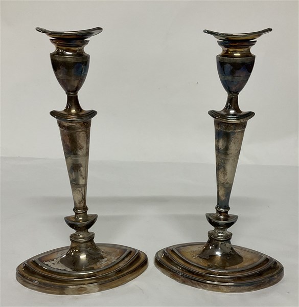 Manifattura inglese, coppia di candelieri in metallo argentato con profili unghiati (cm 29) (lievi difetti)