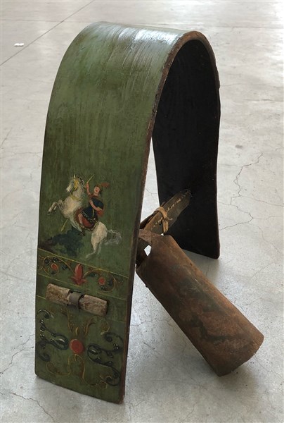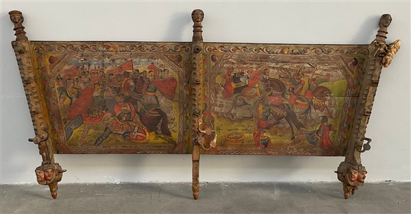 Lotto composto da un fregio di carretto siciliano in legno intagliato dipinto in policromia raffigurante scena di battaglia con Davide e Saul unito a elemento decorativo con campanaccio (cm 140x70) (difetti)