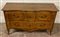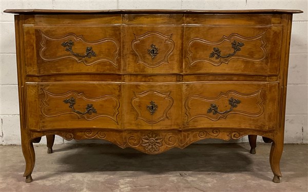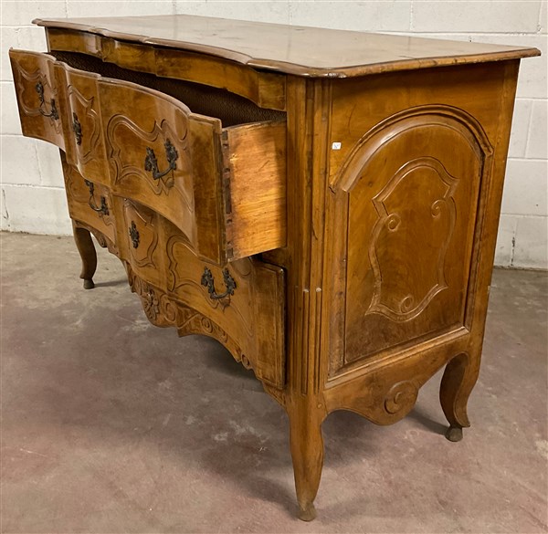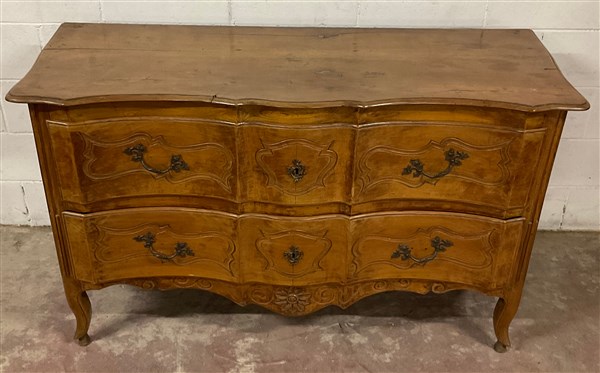 Comò in noce a due cassetti con fregi intagliati, fronte a doppia mossa, gambe e grembiale sagomati. Secolo XVIII (cm 143x88x53) (difetti e restauri)