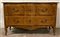 Comò in noce a due cassetti con fregi intagliati, fronte a doppia mossa, gambe