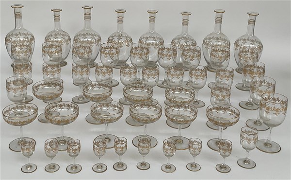 Lotto composto da due cartoni contenenti numerose bottiglie e calici in cristallo profilato in oro con decoro stilizzato di forme e misure differenti (difetti e rotture)