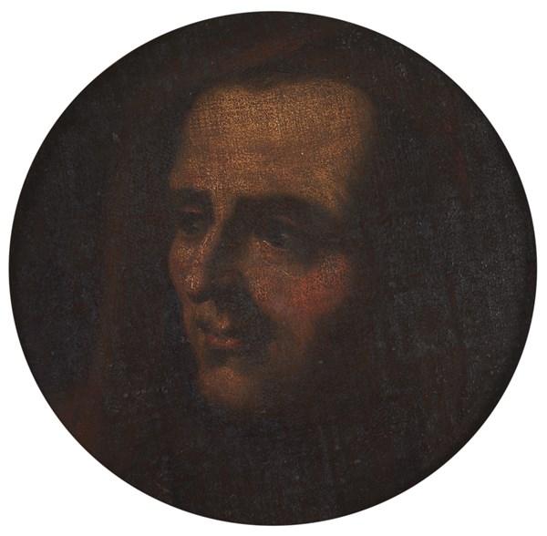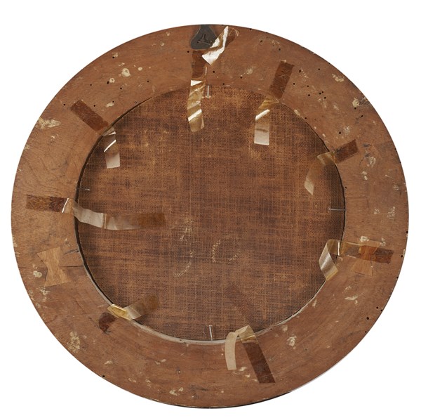 Ignoto, antico dipinto raffigurante un volto (frammento), olio su tela tonda (d. cm 26) in cornice in legno intagliato e dorato del secolo XVIII (difetti)