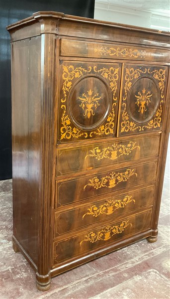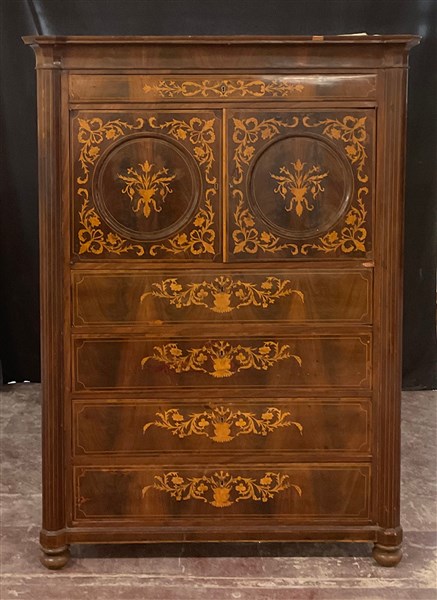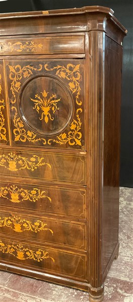Secretaire lastronato in mogano, intarsiato e filettato in legno chiaro, due ante sotto un tiretto a mezza lunghezza rivelano vano e tre cassettini, quattro cassetti sul fronte. Montanti a mezza colonna sfaccettata, piedi a cipolla (cm 128x189x58) (difetti)