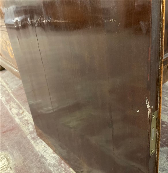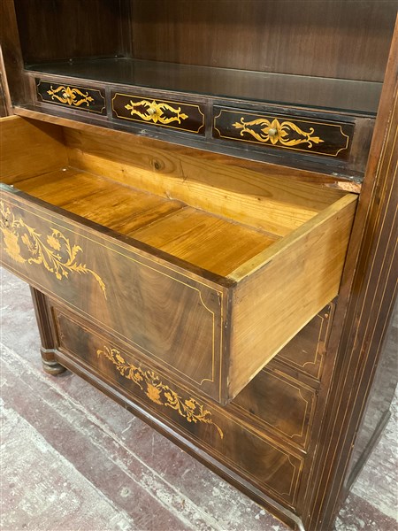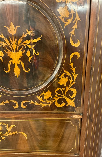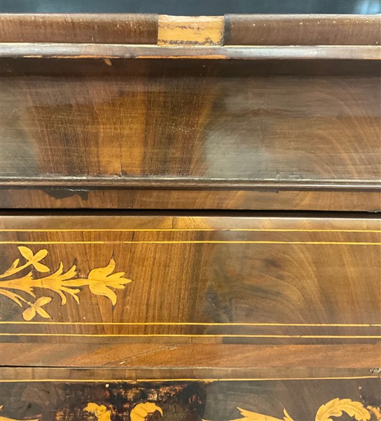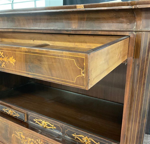 Secretaire lastronato in mogano, intarsiato e filettato in legno chiaro, due an
