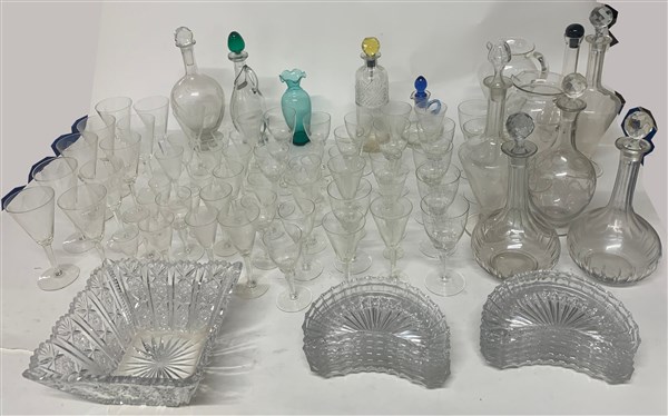 Lotto di tre cartoni contenenti numerosi bicchieri, bottiglie in cristallo e antipastiere di manifatture differenti (difetti)