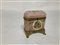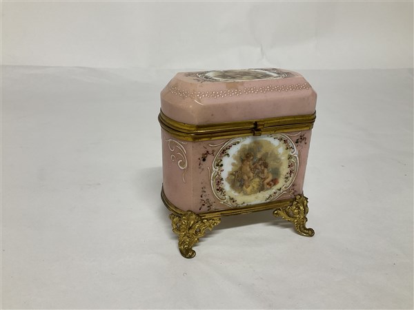 Manifattura francese, scatola in opaline dipinta in policromia con scene di angioletti entro riserve su fondo rosa, guarnizioni in metallo dorato (cm 11,5x9) (lievi difetti)