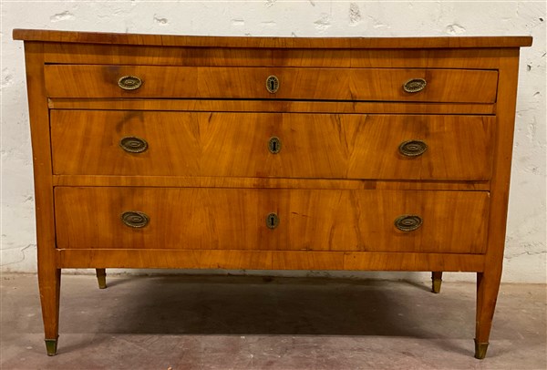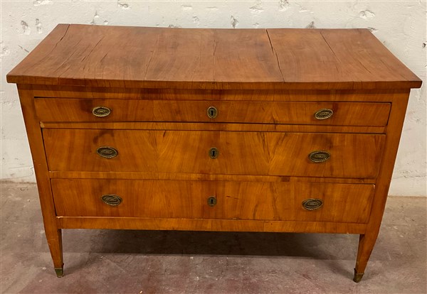 Comò lastronato con fronte a due cassetti sotto uno a mezza altezza, gambe rastremate. Secolo XIX (cm 122x83x54) (difetti)