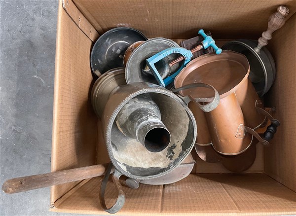 Cartone contenente numerosi oggetti in rame e metallo, epoche diverse (difetti)