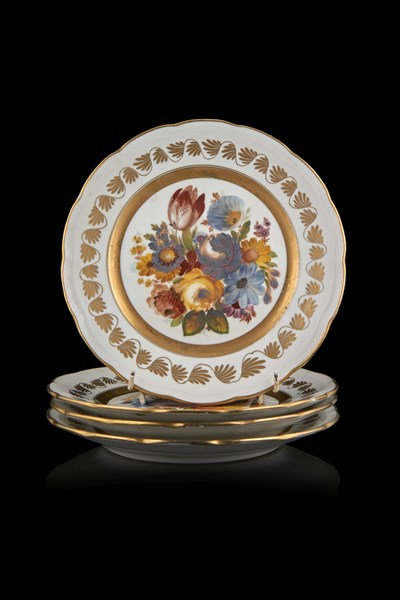 Manifattura di Ginori, inizio secolo XX. Quattro piatti in porcellana decorati nella bordura a foglie e profili dorati e nel cavetto a fiori in policromia (d. cm 24) (difetti)