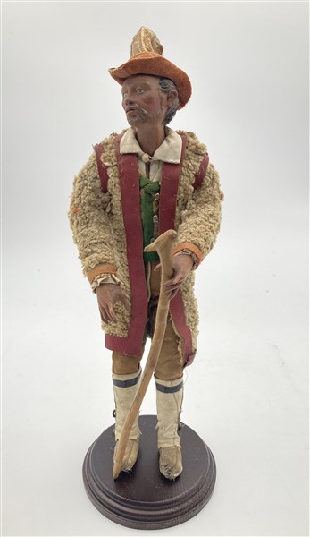Arte napoletana, secolo XIX. "Pastore con bastone" scultura da presepe in terracotta dipinta in policromia, decorata con abiti in tessuto, pelle e applicazioni in metallo, occhi in pasta vitrea. Poggiante su base in legno (h. cm 39) (difetti)