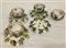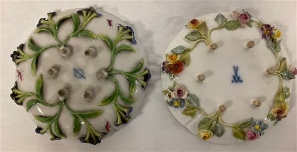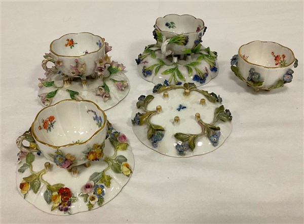 Manifatture differenti. Lotto composto da tre tazzine con piattini in porcellana policroma con finiture in oro e mazzi di fiori a rilievo della manifattura di Meissen, uniti a una tazzina con piattino di decoro simile della manifattura di Horsch. Marchiati al retro (difetti)