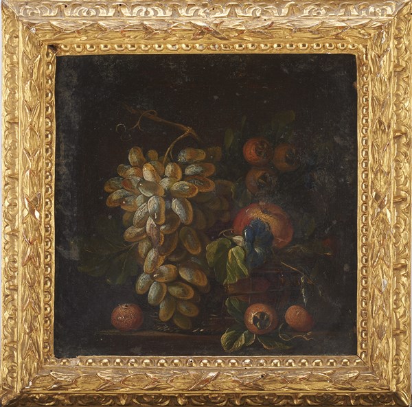 Scuola della fine del secolo XVIII-inizio XIX. Cesto con frutta. Olio su tela (cm 23x24) in cornice dorata a palmette e perlinatura