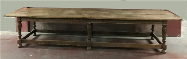 Tavolo da refettorio di forma rettangolare in legno con sei sostegni torniti a colonna, piedi a cipolla, secolo XVIII (cm 423x82x105) (difetti e restauri)