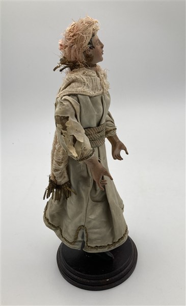 Arte napoletana, secolo XIX. "Popolana con sciarpa" scultura da presepe in terracotta dipinta in policromia, decorata con abiti in tessuti, raso di seta e applicazioni in metallo, occhi in pasta vitrea. Poggiante su base in legno (h. cm 34) (difetti)