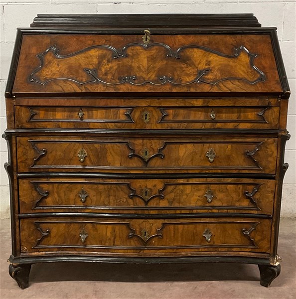 Ribalta lastronata e radicata, profili e cartelle ebanizzate. Fronte a tre cassetti più uno piccolo sottopiano, anta ribaltabile celante sei cassettini. Pianetto con segreti laterali. Lombardia secolo XVIII (cm 115x119x57) (difetti, restauri e mancanze)