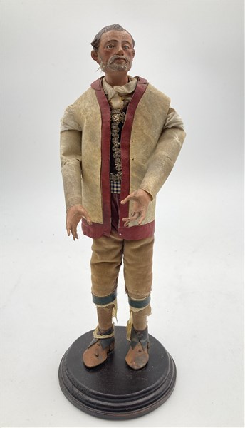 Arte napoletana, secolo XIX. "Figura popolare barbuta" scultura da presepe in terracotta dipinta in policromia, decorata con abiti in materiali diversi e cartapesta, occhi in pasta vitrea. Poggiante su base in legno (h. cm 36) (difetti)