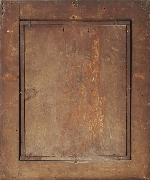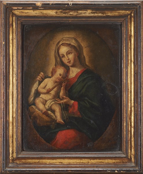 Scuola del secolo XVIII, Madonna con Bambino, olio su tavola (cm 32x25) in cornice del secolo XVIII in legno dorato