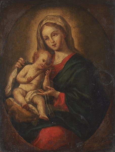 Scuola del secolo XVIII, Madonna con Bambino, olio su tavola (cm 32x25) in corn