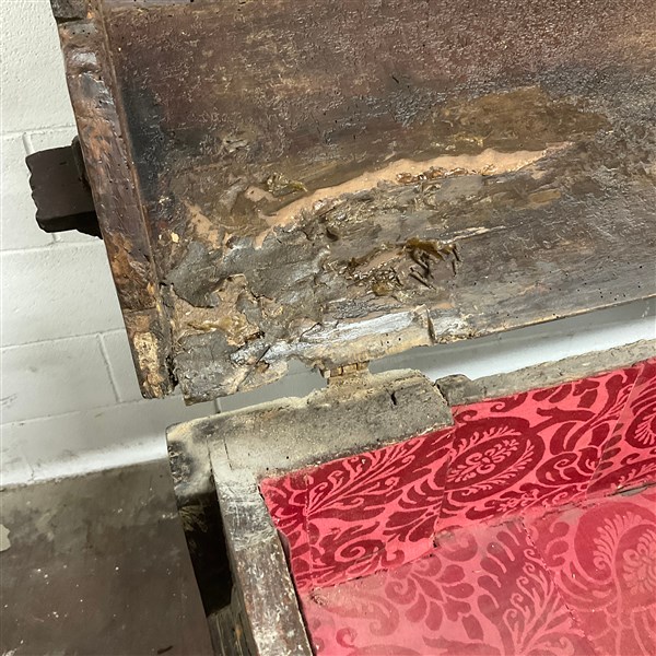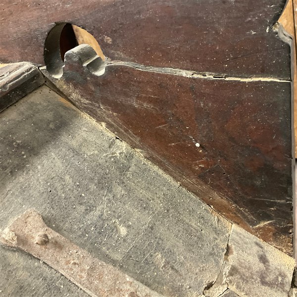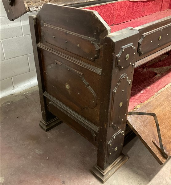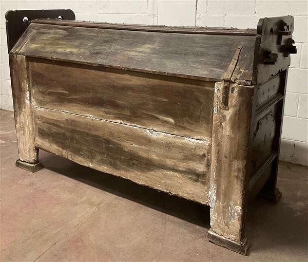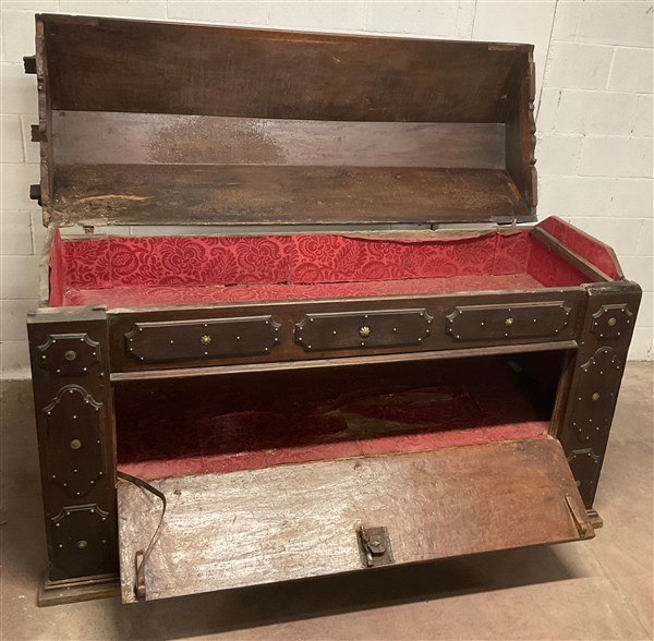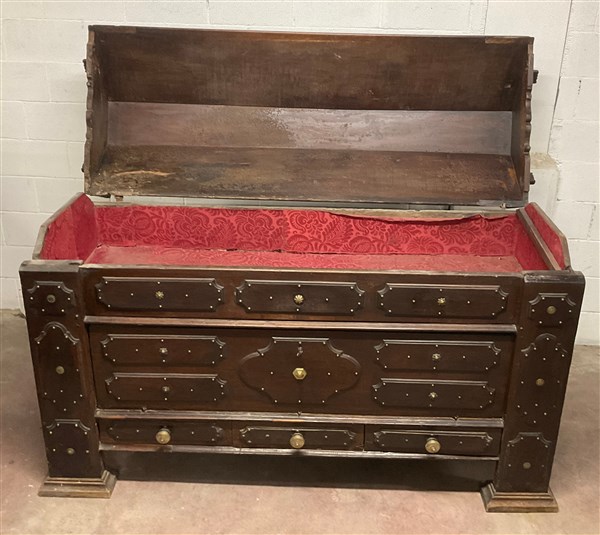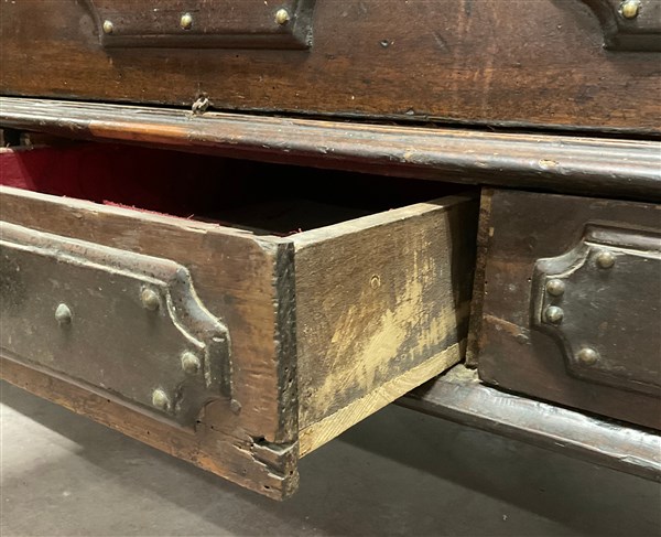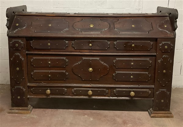 Lot 2073 | Madia pannelata e borchiata in metallo, fronte con calatoia sopra tre cassetti,