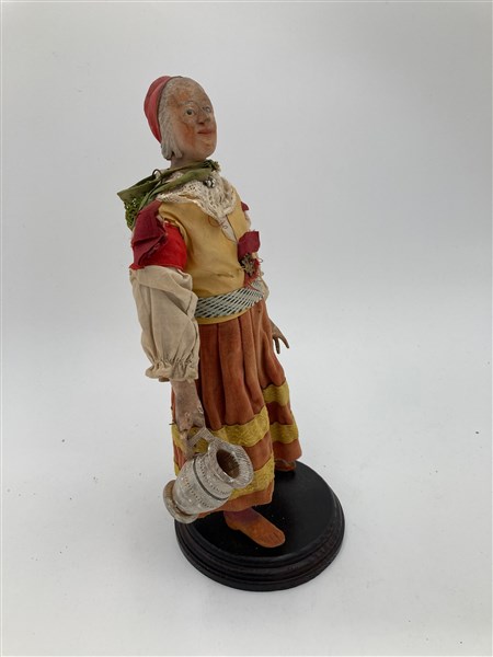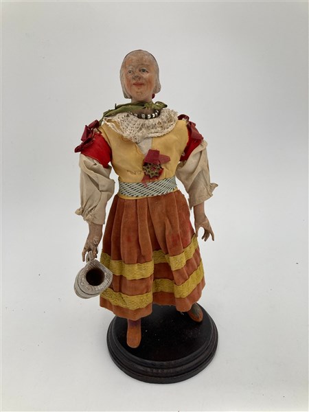 Arte napoletana, secolo XIX. "Popolana con caraffa" scultura da presepe in terracotta dipinta in policromia, decorata con abiti in tessuto e spilla, occhi in pasta vitrea. Poggiante su base in legno (h. cm 31) (difetti e aggiunte)