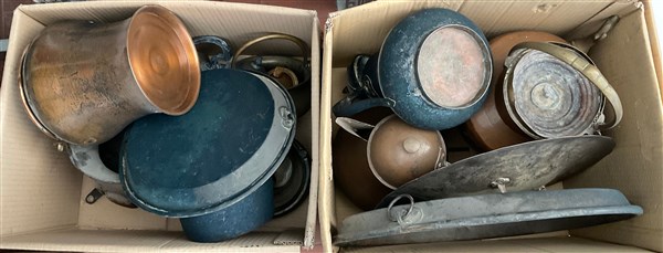Due cartoni contenenti numerosi oggetti in rame e bronzo di diversa epoca e fat