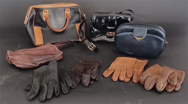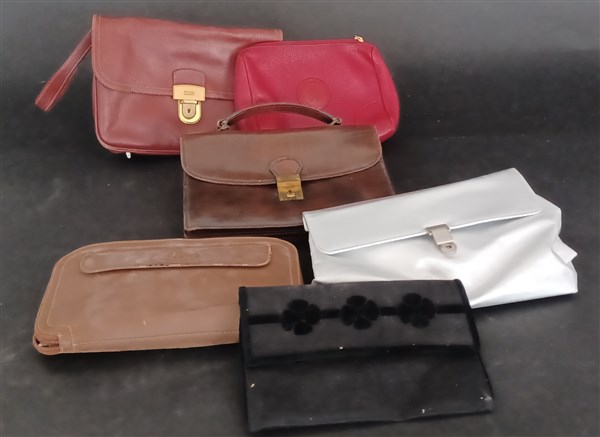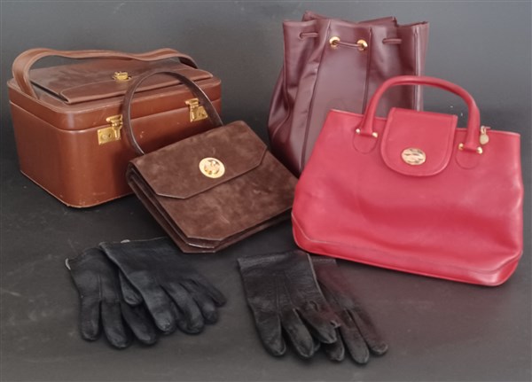 Lotto composto da un beauty case e dodici tra borse, borsette e necessaire in vari materiali e diversi colori, uniti a sei paia di guanti da uomo (difetti e segni d'uso)