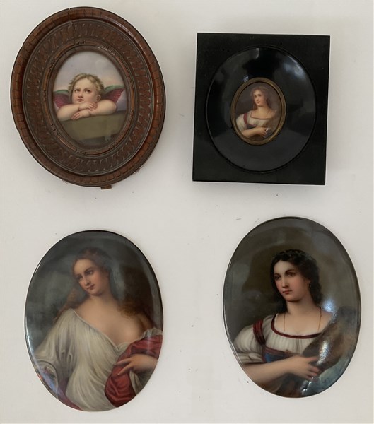 Lotto composto da quattro placche ovali in porcellana dipinta a soggetti da Raffaello e Tiziano, inizio secolo XX. Misure diverse (difetti)