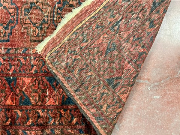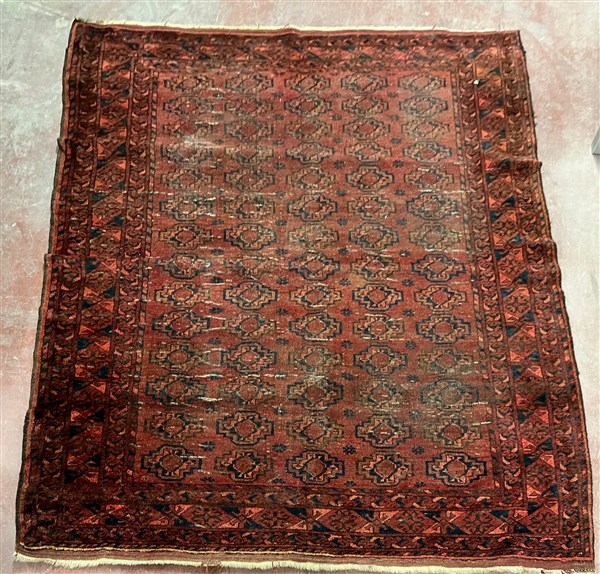 Tappeto Beshir, Turkestan occidentale, fine secolo XIX. Decoro con file di Gul su fondo rosso scuro (cm 206x174) (difetti, rapature e vecchi restauri)