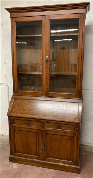 Mobile a due corpi in rovere con parte superiore a due ante a vetri e parte inferiore a ribalta e due ante con scarabattolo a vani e cassetti (cm 107x222x50) (difetti)
