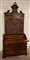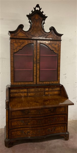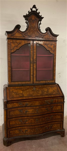 Antico trumeau lastronato in noce con profili ebanizzati di forma mossa, cimasa ad arco spezzato, due ante a vetro e calatoia rivela sei tiretti. Tre cassetti sotto uno a mezza lunghezza. Lombardia (cm 131x213x60) (difetti e restauri)