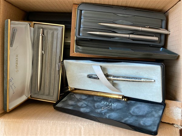 Cartone contenente numerose penne la maggior parte Parker in argento e metallo (difetti)