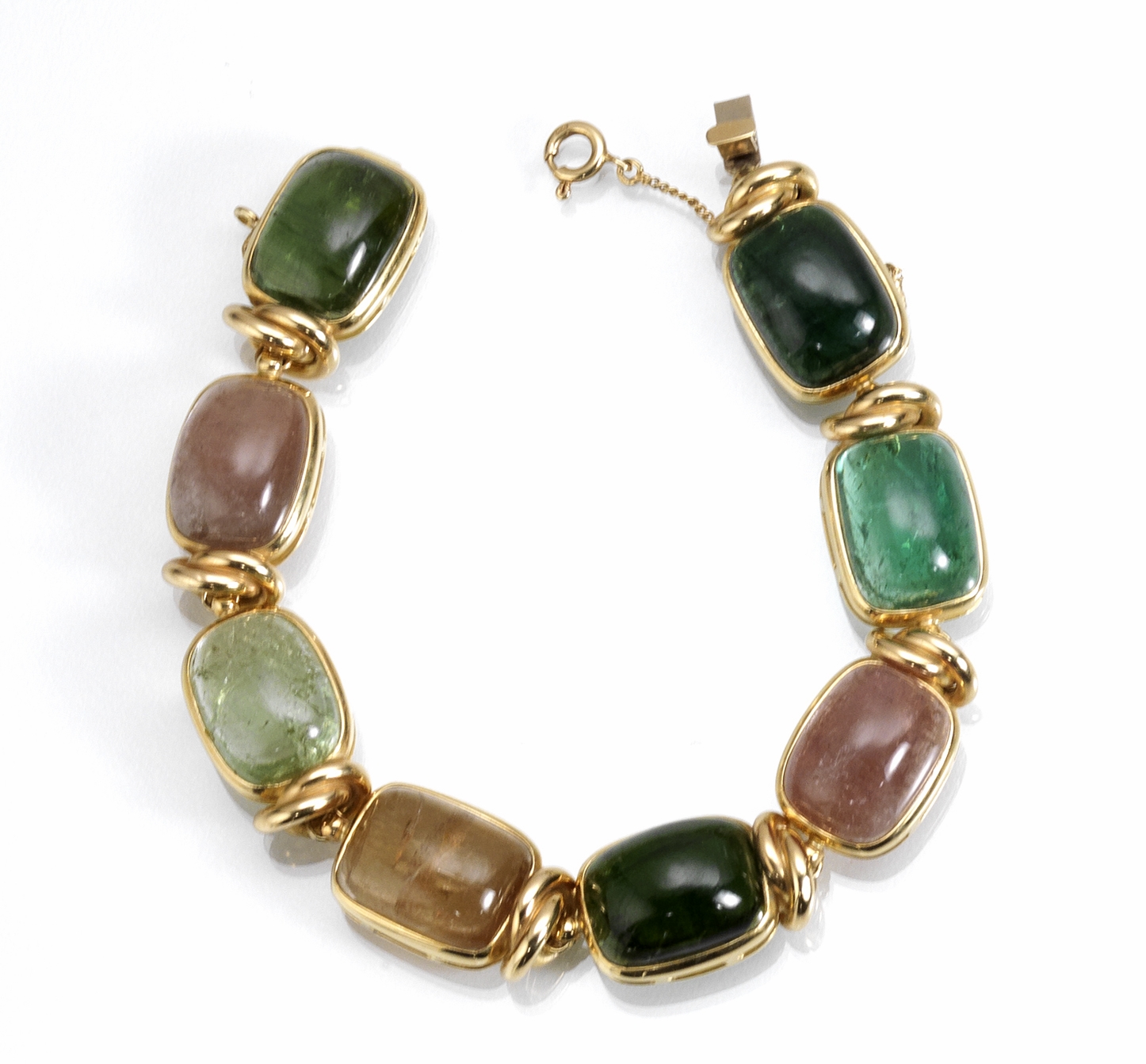 realizzato ad una fila di tormaline verdi e rosa cabochon con base rettangolare e montatura a castone unite da anelli intrecciati in oro giallo, punzone 750, lungh. cm 19 circa, g 45