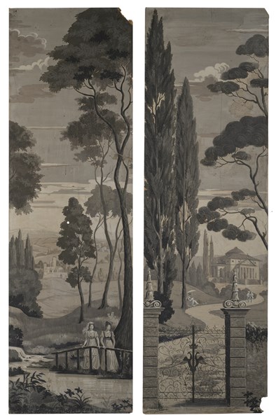 Lot 2134 | Ignoto. Due papier peint raffiguranti ingresso di villa e figure in riva al fiu