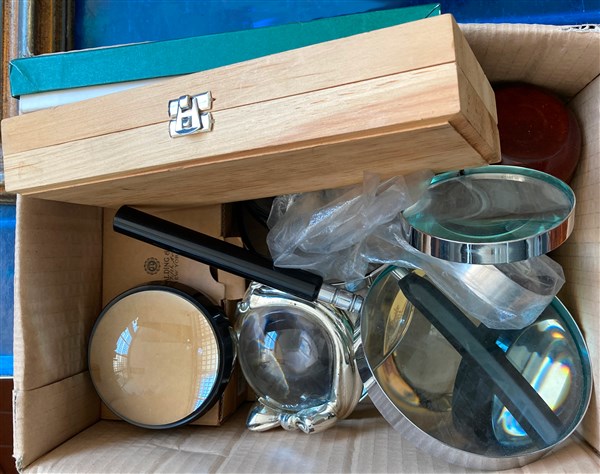 Cartone contenente numerose lenti e contafili di diversa fattura (difetti)