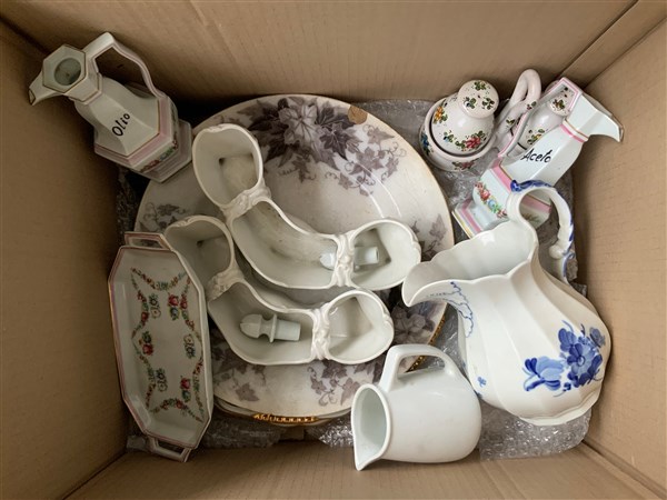 Cartone contenente numerosi oggetti in ceramica di forme, usi e decori differen