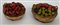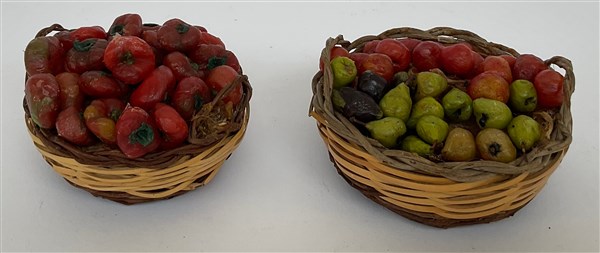 Arte dell'Italia meridionale, secolo XIX. Lotto composto da due cestini da presepe in vimini contenenti frutti e verdure in cera (cm max 10x7) (difetti)