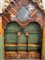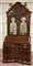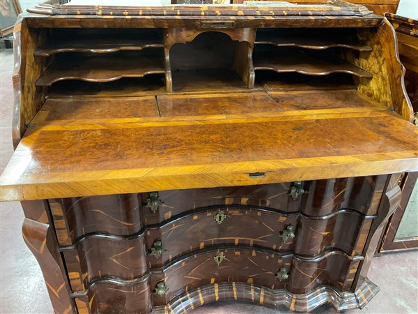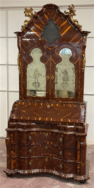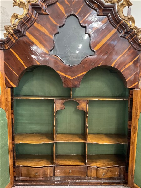 Trumeau lastronato in carrubo e legni vari. Parte superiore con due ante a specchio decorate da figure in maschera, cimasa sagomata centrata da cartella in vetro inciso con stemma araldico, fregi in legno intagliato e dorato a volute e motivi fogliacei. Parte inferiore con fronte di linea mossa e spezzata, sagomata a tre cassetti e anta ribaltabile celante tiretti e vani, la calatoia rivela segreti e scomparti. Padova, secolo XVIII (cm 120x250x63) (difetti e mancanze)
