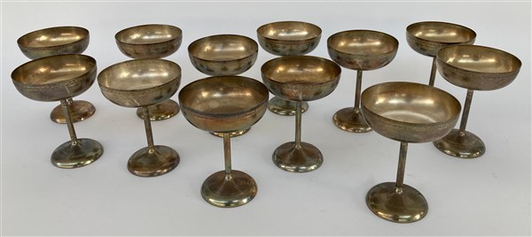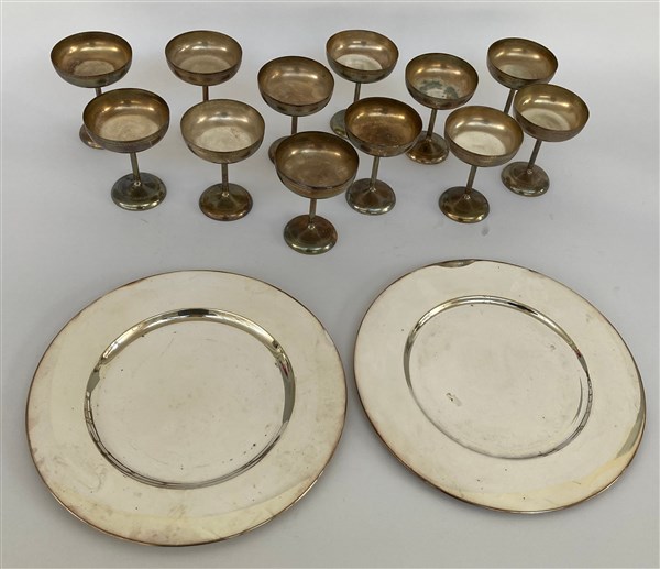 Cartone contenente numerose coppe e due vassoi in metallo argentato (difetti)