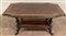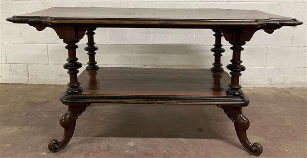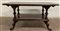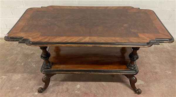 Tavolo da centro con piano di forma sagomata lastronato in legni vari, gambe mosse riunite da pianetto. Secolo XIX (cm 160x80x85) (difetti)
