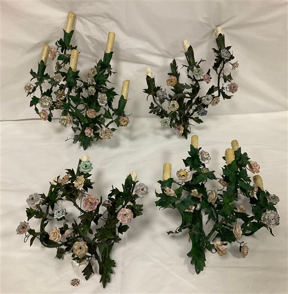 Gruppo di quattro applique a tre e cinque fiamme in metallo laccato decorato a foglie e fiori in porcellana (h. cm 35) (difetti)