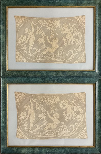 Coppia di pizzi fillet in cotone, Italia, fine secolo XIX. Raffiguranti amorini con tralci d'uva (cm 41x28) in cornici (difetti)