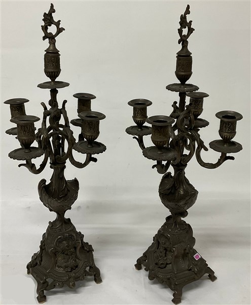 Coppia di candelabri in metallo a cinque fiamme con decori a motivi fogliacei e floreali (h. cm 52) (difetti e mancanze)