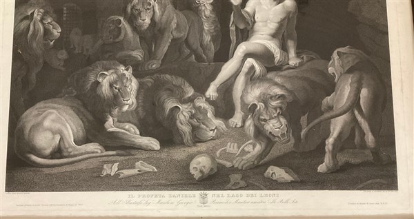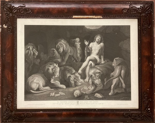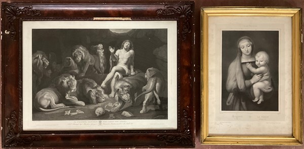Lotto di due incisioni del secolo XIX raffiguranti una "Madonna con bambino" da Raffaello e "Il Profeta Daniele nel lago dei leoni" da Rubens, misure diverse, in cornici (difetti)