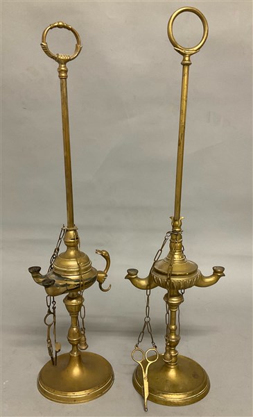 Lotto composto da due lampade fiorentine in bronzo con coppa a due fiamme, con accessori (h. max cm 62) (lievi difetti)