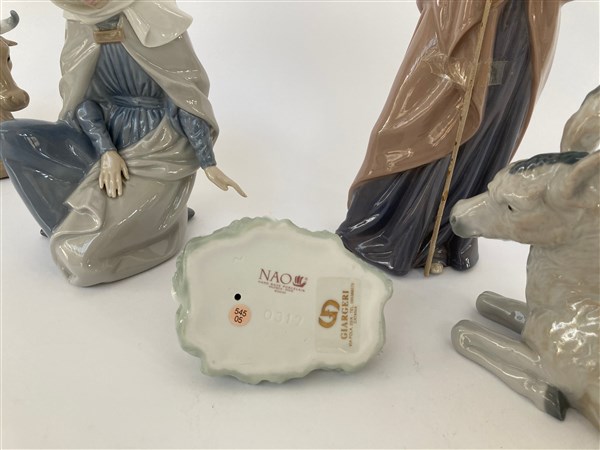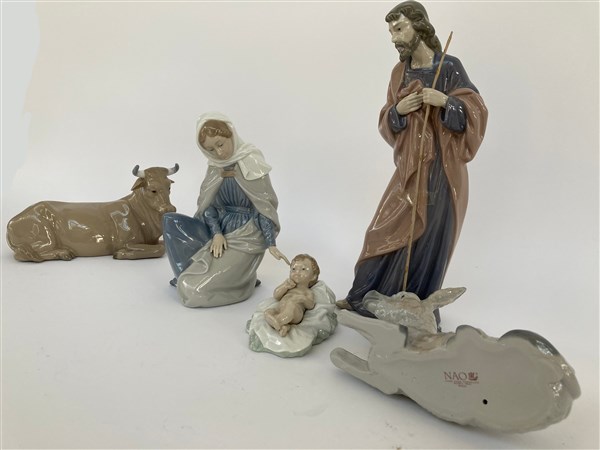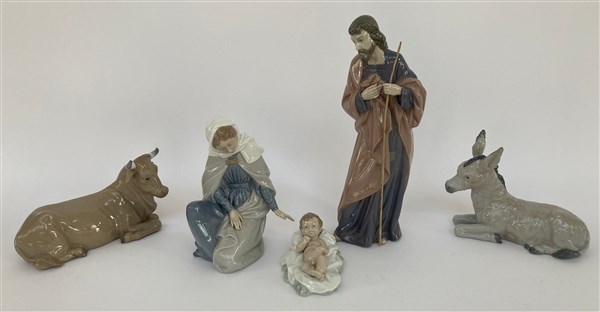 Lotto composto da cinque figure da presepe in porcellana dipinta in policromia raffiguranti Maria, San Giuseppe, il Bambino, bue ed asinello. Valencia, secolo XX. (h max cm 28)
