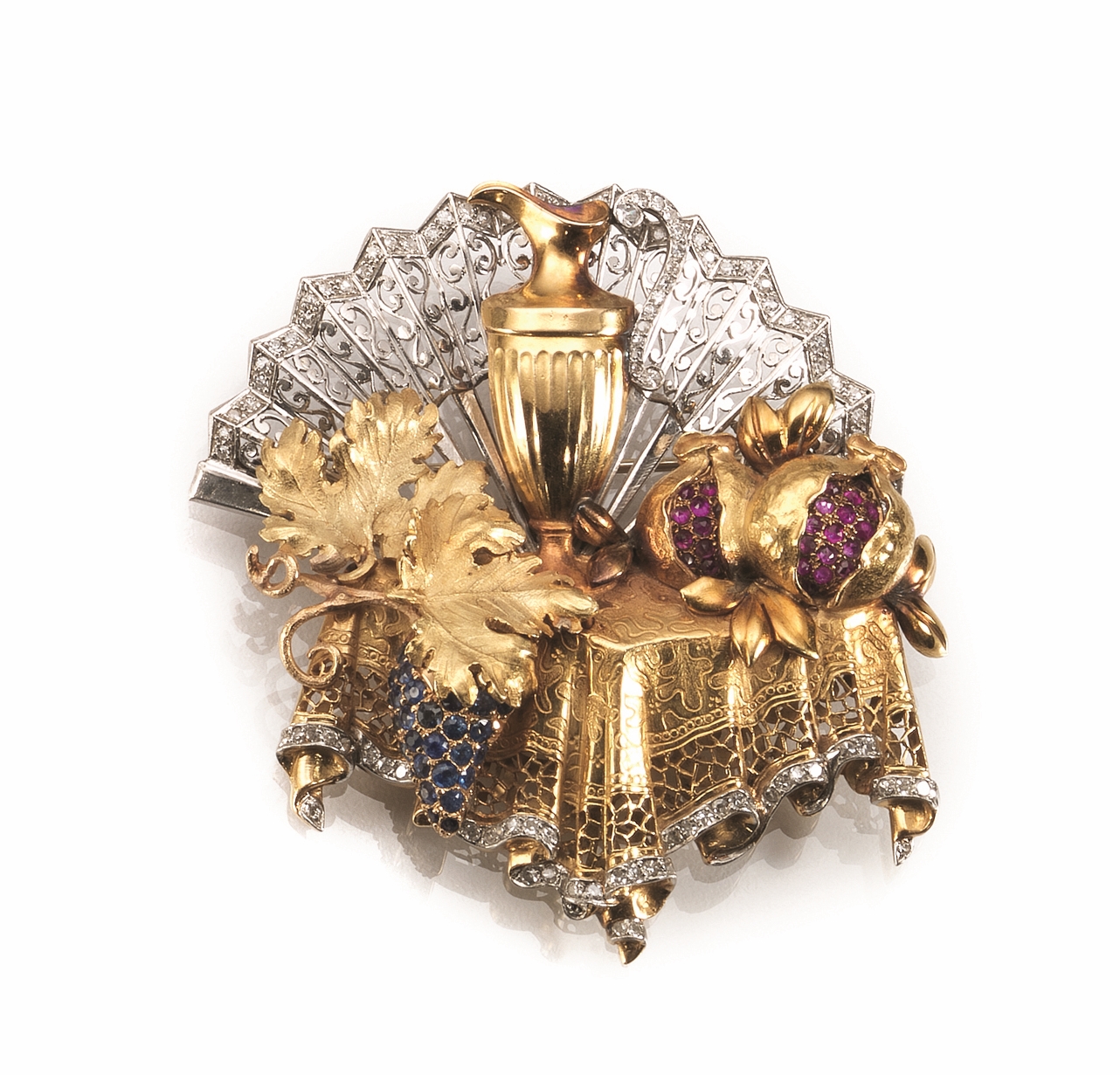 melograni, uva e ventaglio amovibile in oro giallo ed oro bianco traforato, cesellato ed impreziosito da piccoli zaffiri, rubini e diamanti, g 45, su un disegno di Assen Peikov