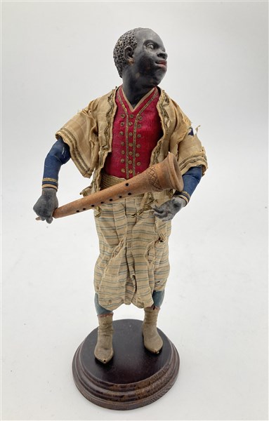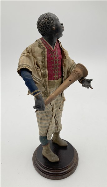Arte napoletana, secolo XIX. "Moretto suonatore" scultura da presepe in legno ebanizzato, decorata con abiti in stoffa e raso di seta, recante nella mano destra un corno in legno intagliato, occhi in pasta vitrea. Poggiante su base in legno (h. cm 29) (difetti)