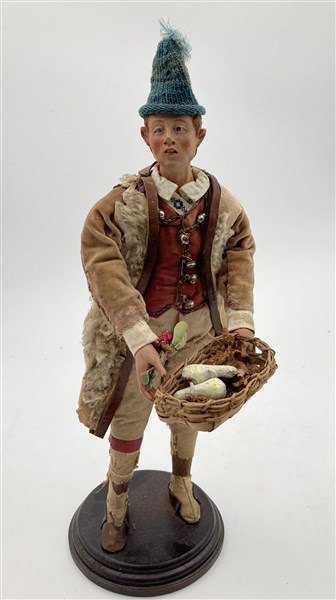Arte napoletana, secolo XIX. "Contadino con cesto di vimini" scultura da presepe in terracotta dipinta in policromia, decorata con abiti in tessuto e pelliccia, copricapo in lana verde, occhi in pasta vitrea. Poggiante su base in legno (h. cm 38) (difetti)