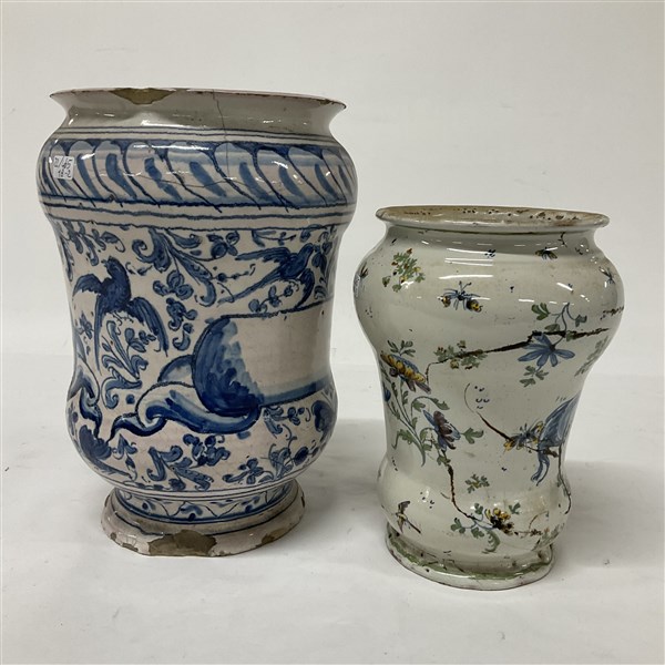 Manifatture diverse, lotto di due albarelli in maiolica e porcellana dipinti a motivi naturalistici di fatture ed epoche differenti (h cm 23 e 18) (difetti)